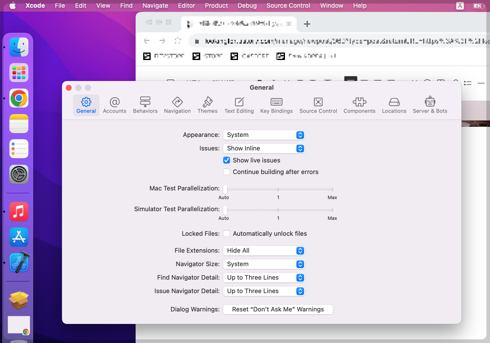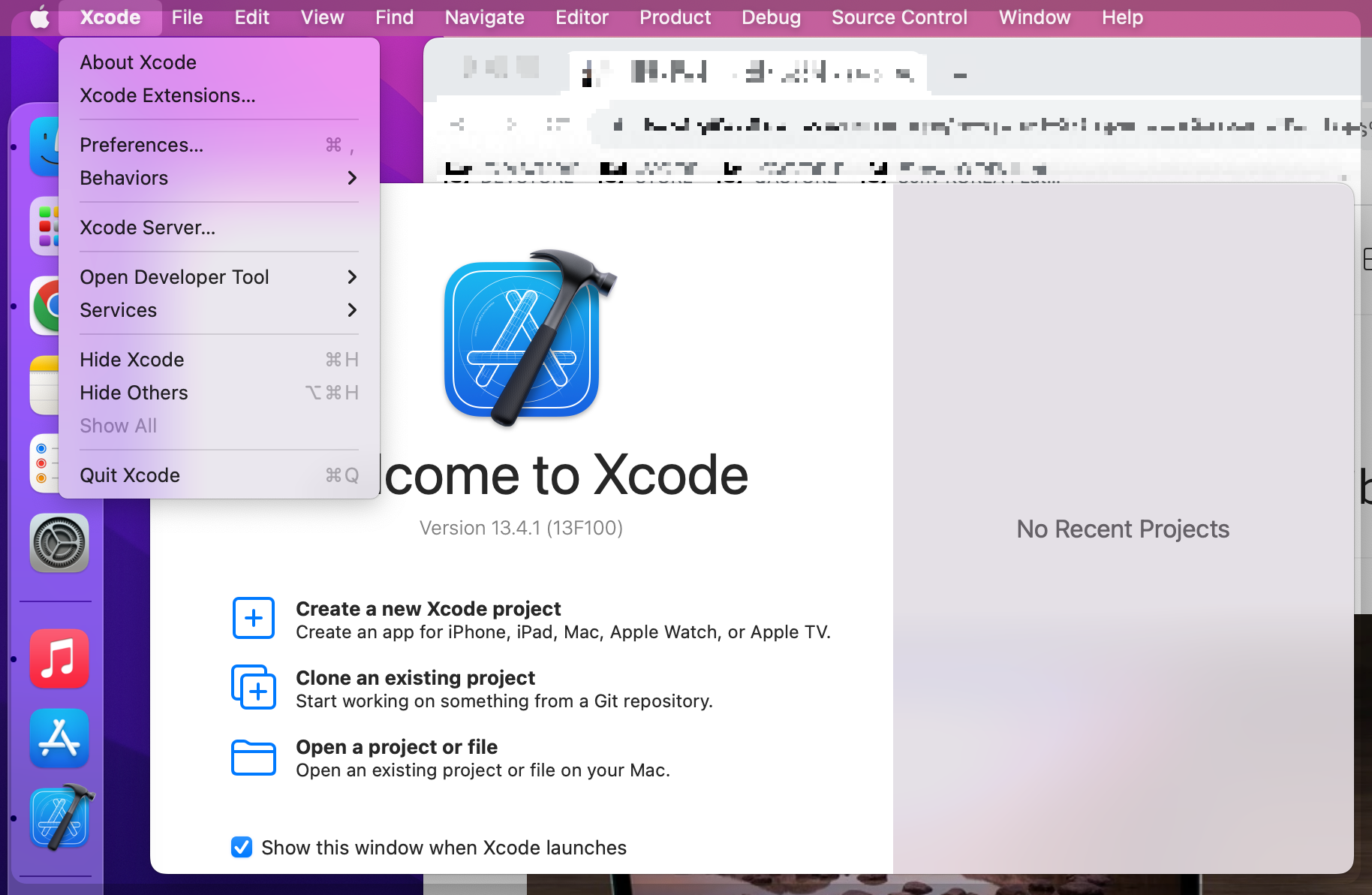 Xcode 앱을 실행한 후, 왼쪽 상단에 preference를 클릭 합니다.