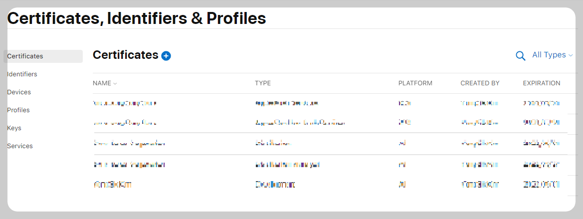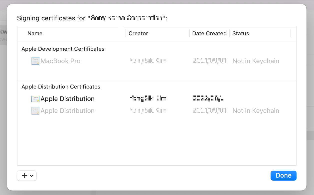 이 화면에서 좌측 하단에 + 버튼을 눌러서 'Apple Distribution Certificates'를 추가해주면 됩니다.