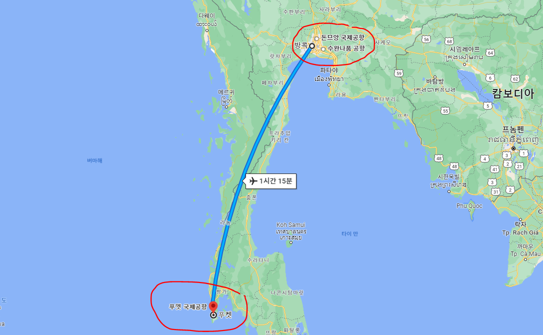 방콕에서 푸켓까지는 다양한 이동 수단이 존재하는데요, 항공, 철도, 버스가 있는데, 차로 870KM 거리를 거리를 가는 건 12시간이 소요되기 때문에 비행기로만 이동해 봤습니다. 항공으로는 1시간 15분이 걸리는 거리로 서울에서 제주도 가는 거리보다 조금 더 걸리는 수준입니다.
