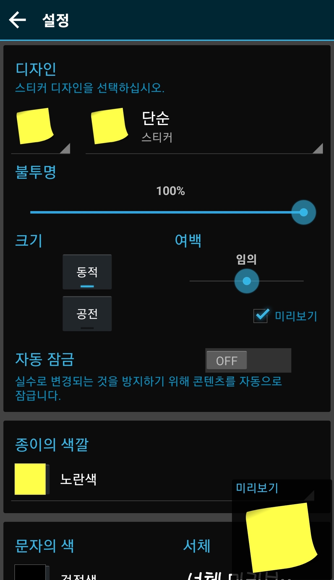 여백의 크기, 메모지의 투명도, 메모지 스타일 등 설정 가능합니다.