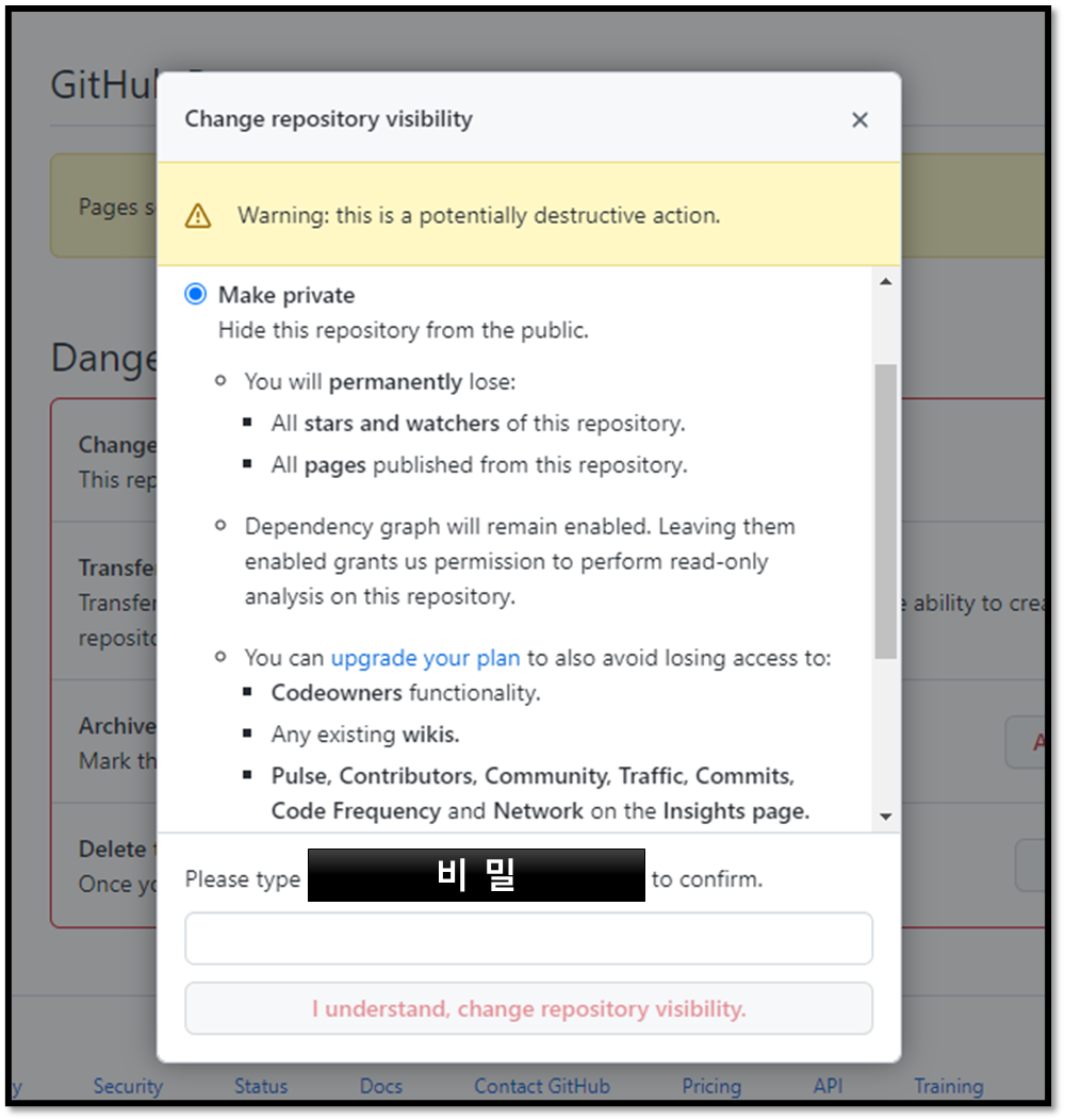 다 확인했다면, 하단에 버튼을 클릭하면 바로 private 처리됩니다.