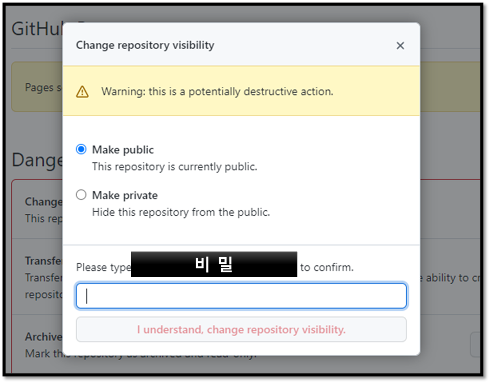 깃허브에서 레파지토리의 공개 여부를 변경할 수 있는 설정을 소개합니다.