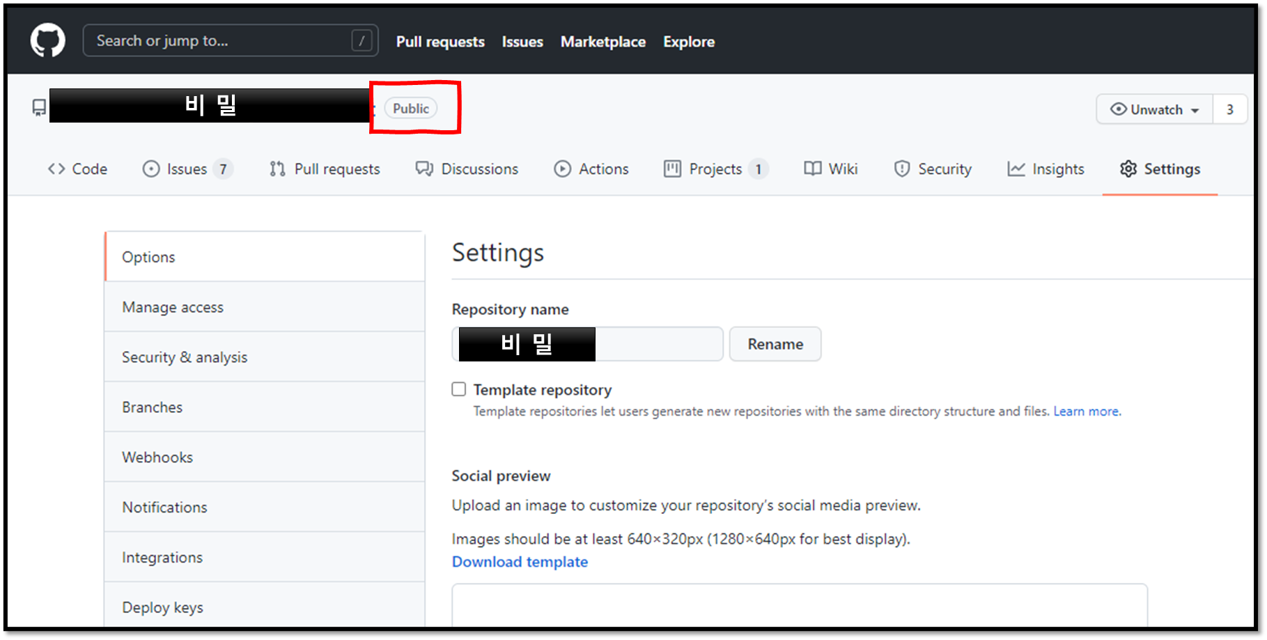 깃 레파지토리 공개/비공개 전환