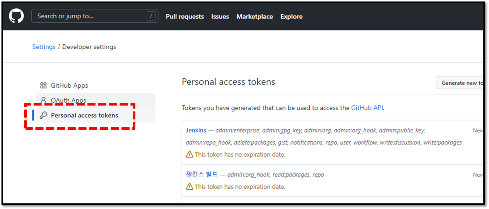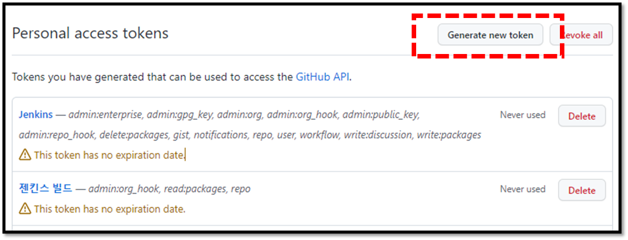 깃허브와 젠킨스를 연동하거나 기타 외부에서 레파지토리를 접근하려면 개인 토큰이 필요하다. 깃허브 토큰은 로그인한 후에 발급받을 수 있는데, 원격에서 레파지토리를 접근할 때 각종 권한을 제어하고, 권한에 유효 기간을 두는 목적으로 사용한다.