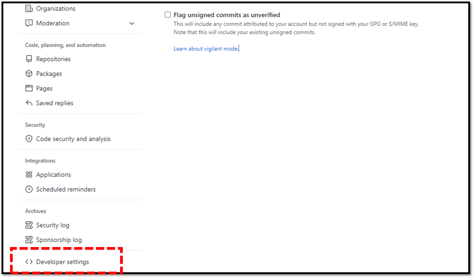 좌측 메뉴 하단에 '<> Developer settings' 클릭