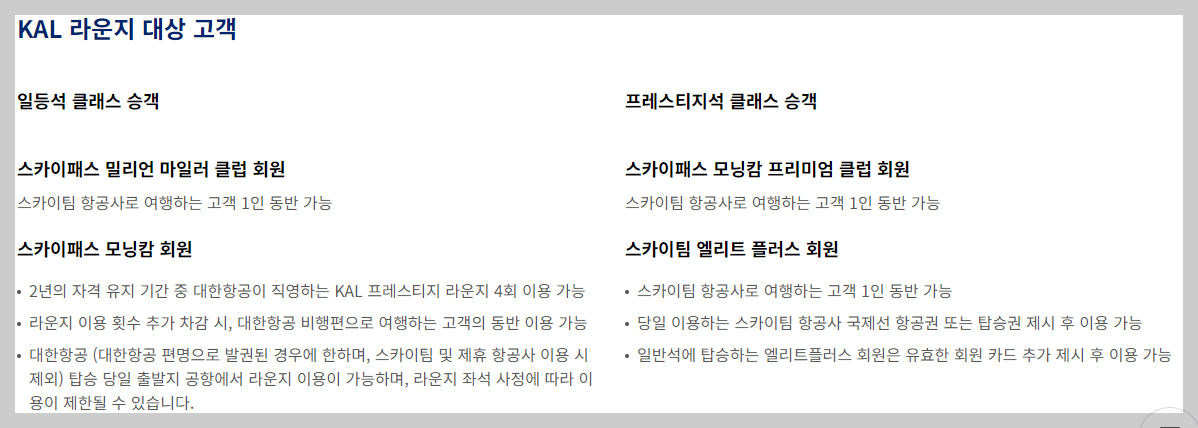 먼저 대한항공 칼 라운지 이용 대상은 아래와 같습니다.
