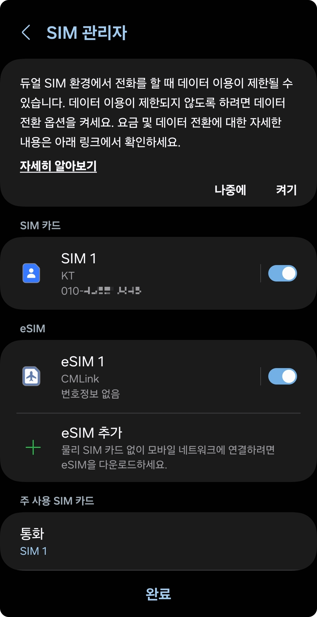 방법은 SIM 관리자 메뉴로 와서 활성화시킨 다음,