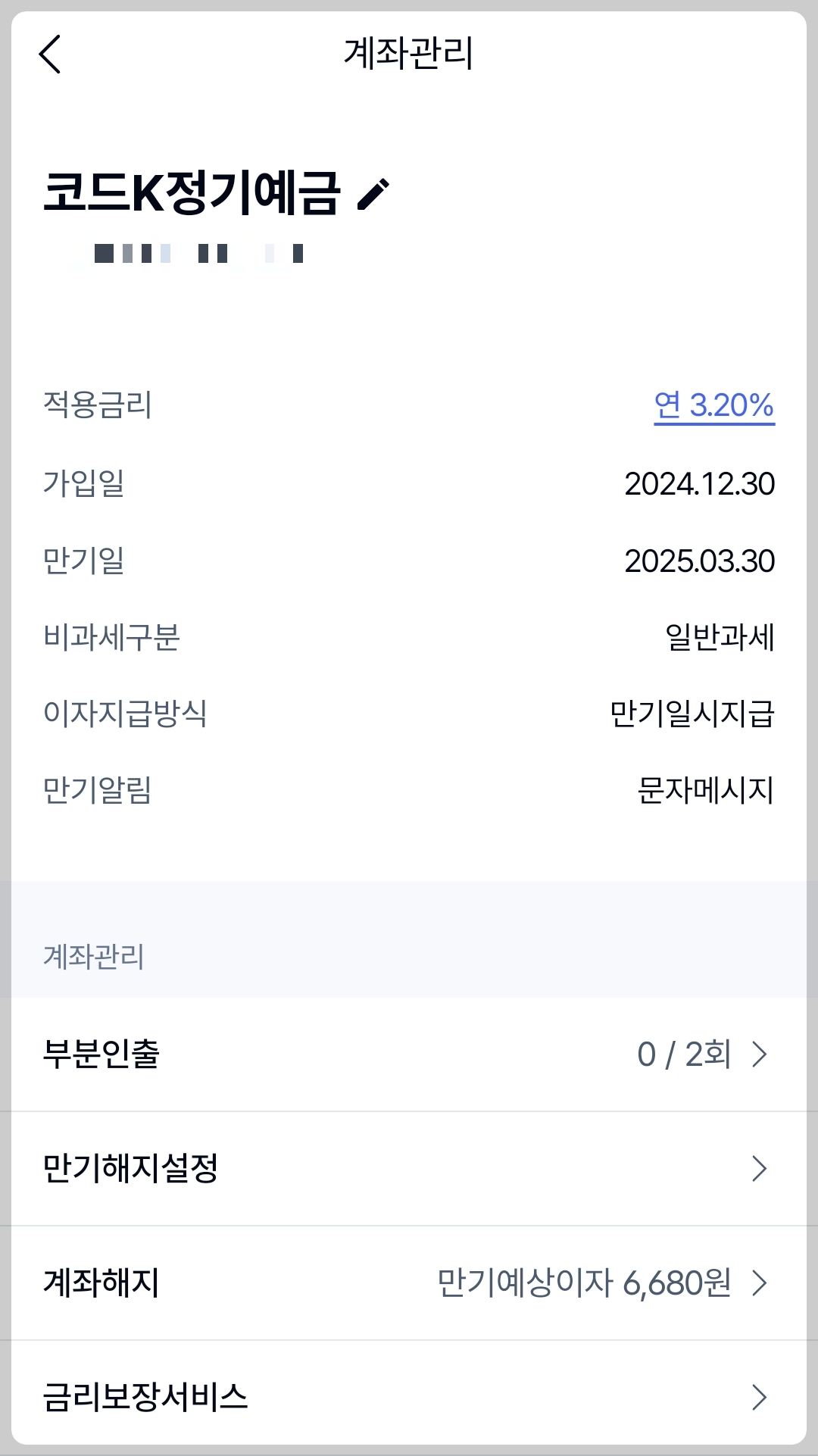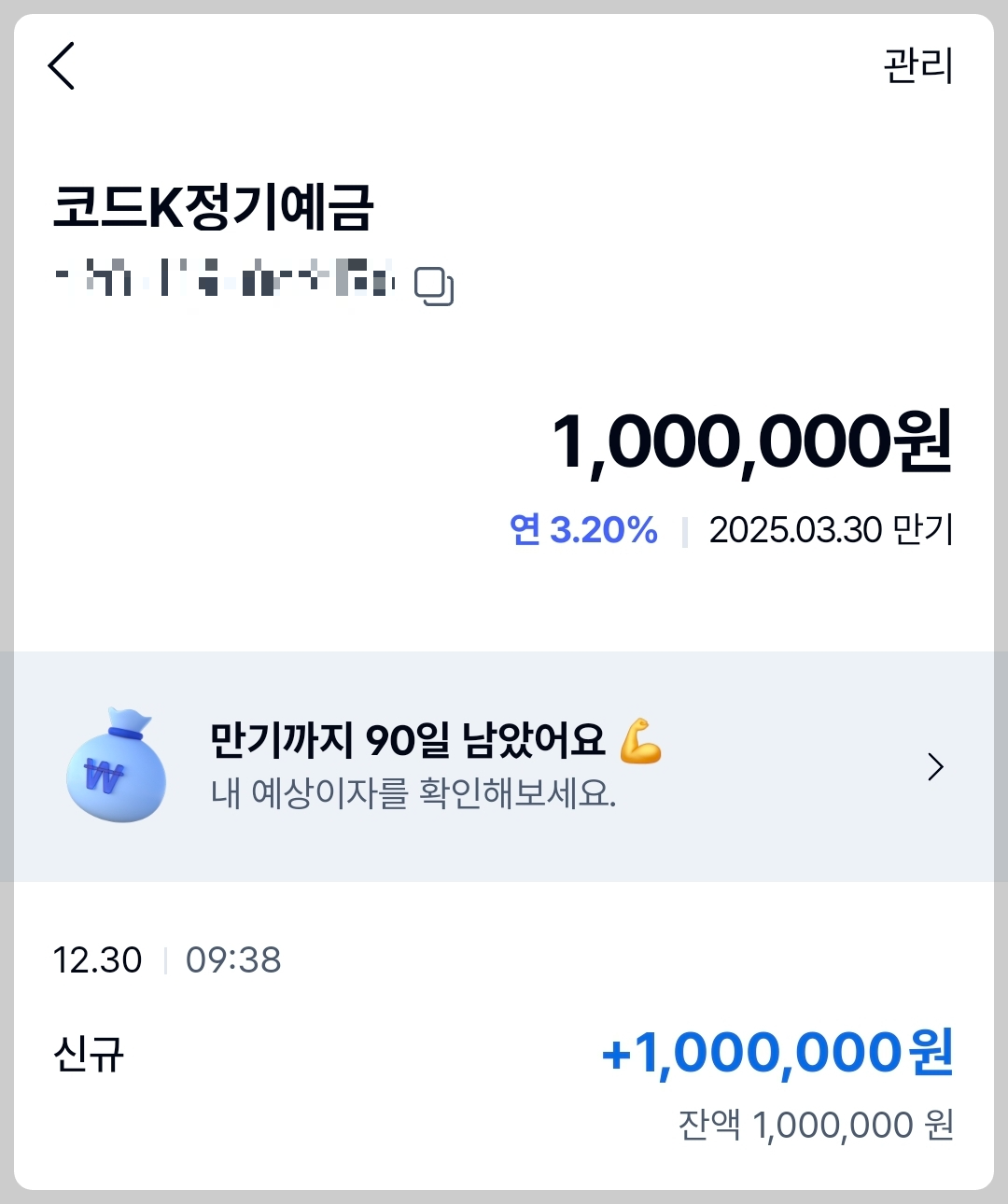 24년 12월 기준으로 소액 단기 예금을 가입하려고 조회해 보니 케이뱅크가 이율이 조금 더 높아서 '코드K 정기예금' 을 개설하게 됐습니다. (연 기준 세전 최대 3.1%)