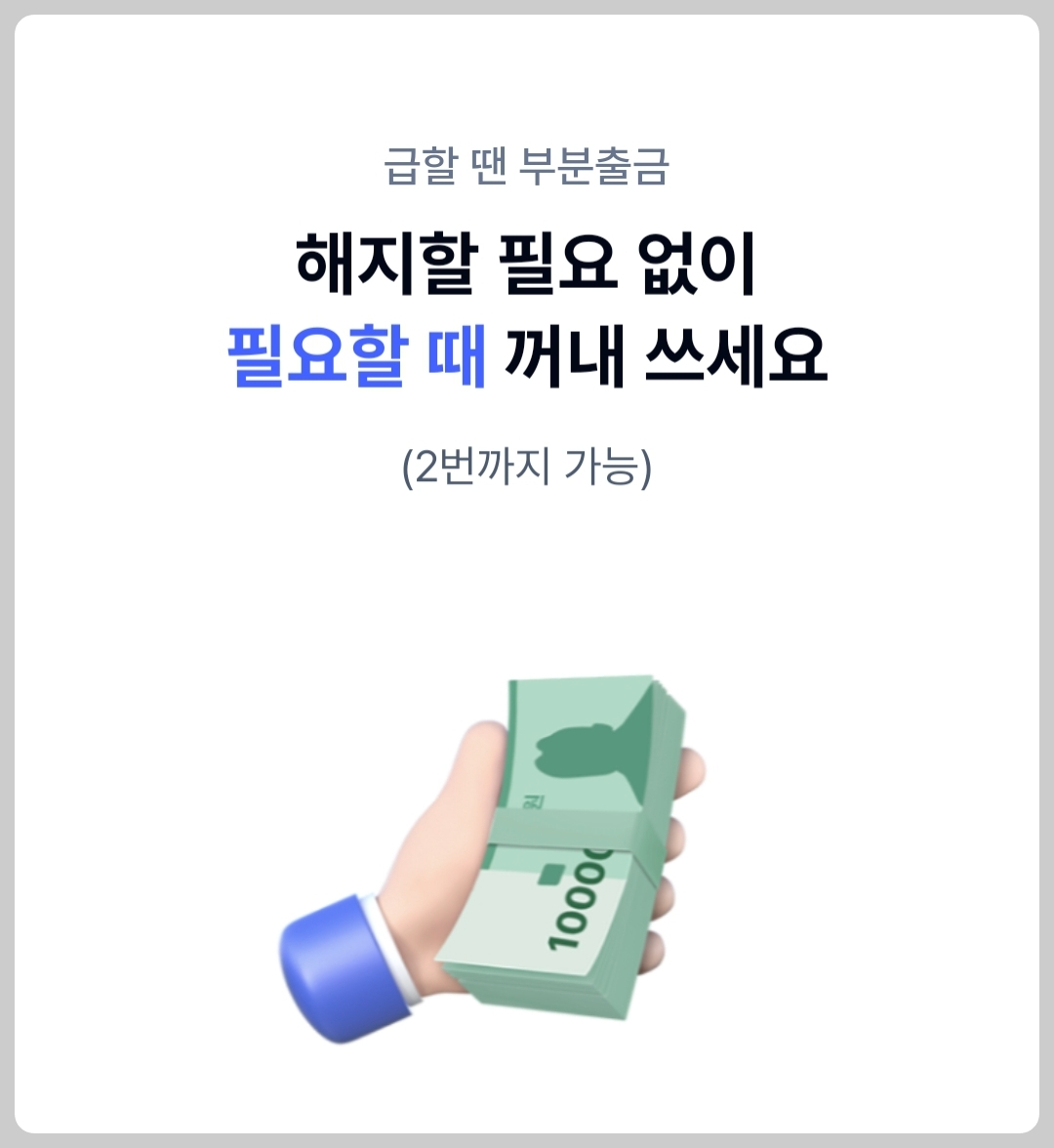 목돈이 없어도 매달 또는 매일 저축 가능. 상품 유형에 따라 추가 납입도 가능. |