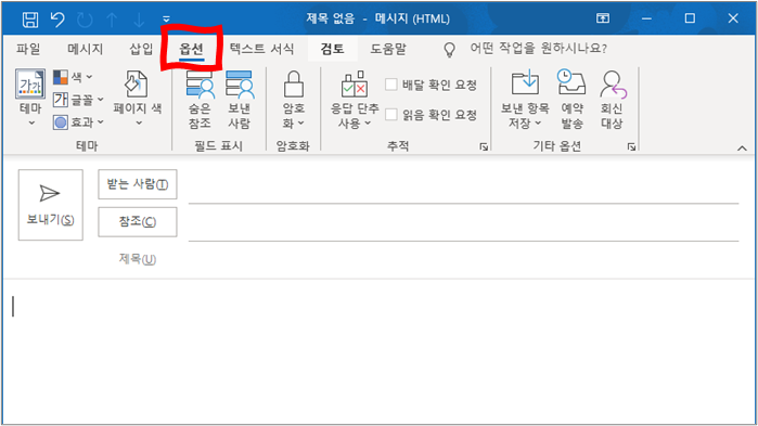 우선 신규 메일이나 기존 수신받은 메일 창에서 상단에 '옵션'이라는 항목을 클릭합니다.