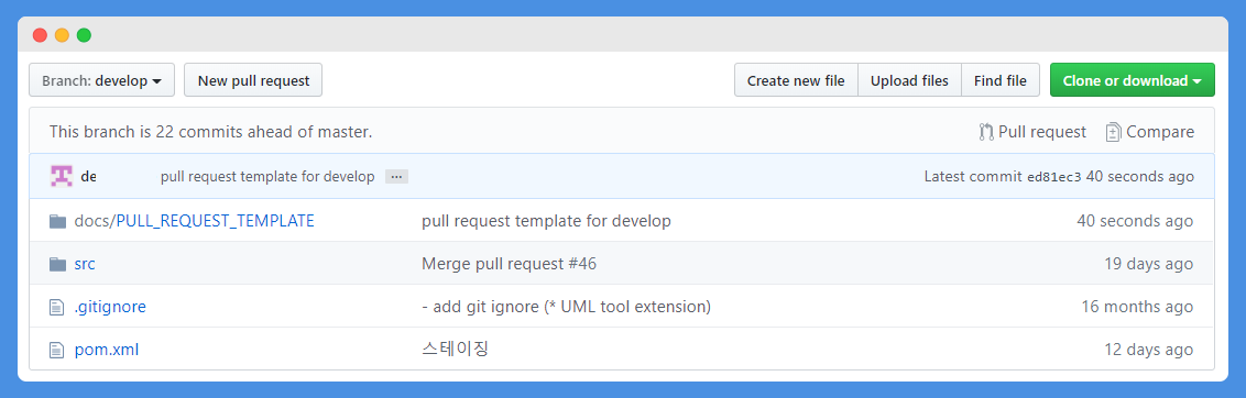 * 참고로 아래 이미지에서는 마스터로 만들었지만, 실제 작업은 develop에서 했습니다.
