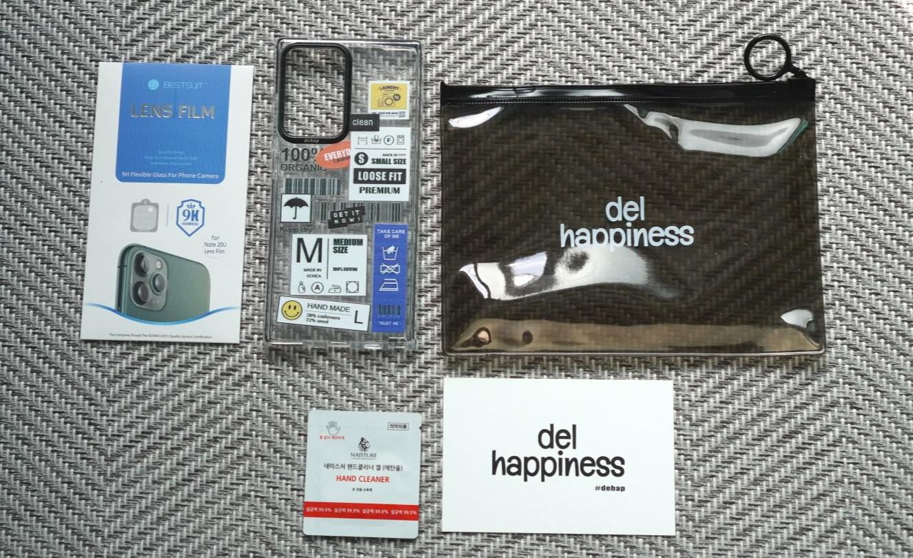 델해피니스의 라벨 케이스는 포장부터가 벌써 인싸의 기운이 느껴졌습니다ㅋ 기분이 좋아지는 해피한 파우치에 디자인, 후면 카메라 보호 필름까지 포함되어 있습니다.