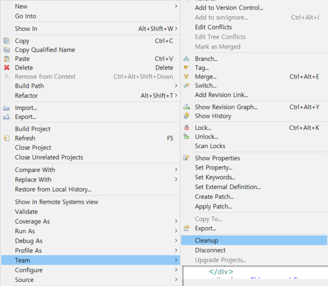 프로젝트 우클릭 후 아래와 같이 cleanup 선택하면 된다.