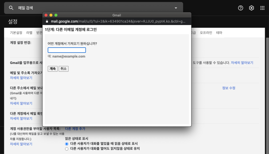 그리고 뜨는 화면에서 '메일 및 주소록 가져오기' 클릭