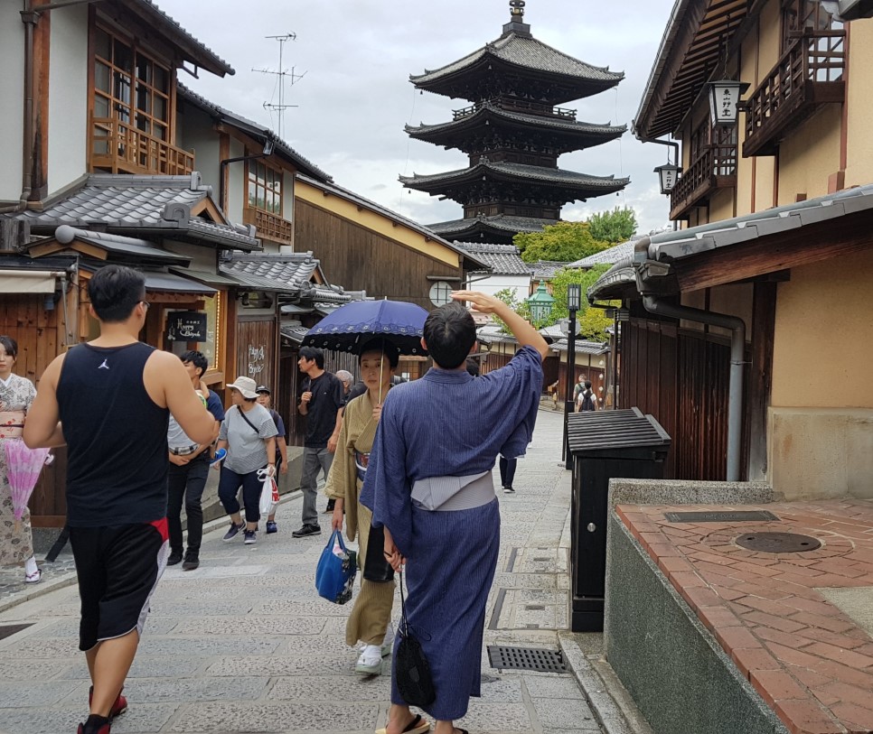 청수사에서 기온 거리를 걷다 보니 멀리서 거대한 탑의 모습이 보이기 시작했습니다. 주변 전통 가옥들과 거대한 탑의 조화가 너무 아름답습니다. 사진도 찍으면 전부 작품이 되는 것 같습니다. 그냥 여기서 1박 하면서 하루 종일 보고 싶네요ㅎ