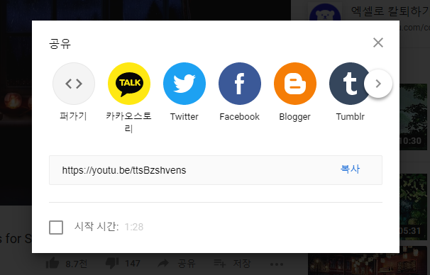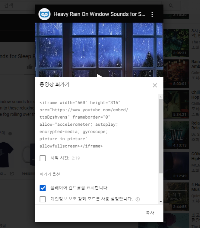 이때 영상이 시작할 시간을 강제로 지정하거나 개인정보를 강화한다거나 기타 등등 몇 가지 설정을 추가할 수 있다. 단 설정이 적용되려면 당연히 설정 후에 '복사'를 눌러야 한다.