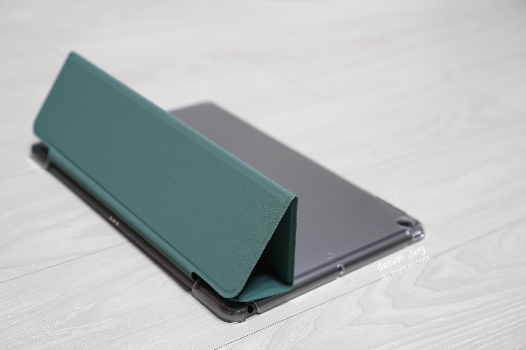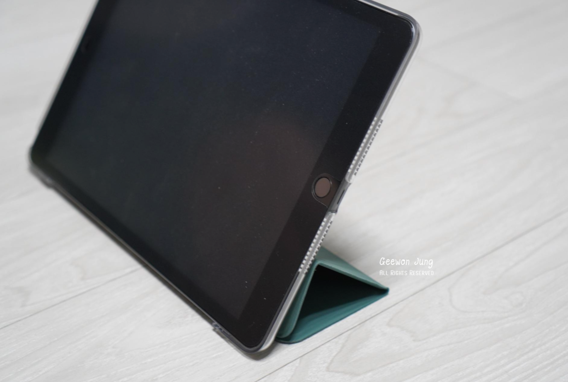 커버 케이스의 장점은 뭐니 뭐니 해도 세워서 거치 가능하다는 점입니다. 커버 끝 부분에 자석이 내장되어 있어서 아래와 같이 접어서 부착할 수 있습니다. 특히 안으로 접히는 방식이라 차지하는 공간도 적어서 들고 다이면서 사용하기 정말 편리합니다.