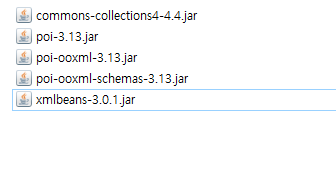 저는 위에 5개 라이브러리를 추가하니 엑셀 관련 객체들이 정상적으로 동작하였습니다. 이 중에서 특히 최신 poi 라이브러리를 사용하면 수많은 라이브러리들의 버전이 함께 높아야 해서 오류가 가장 많이 났습니다. 처음에 5 사용했다가 바로 3으로 내렸습니다..