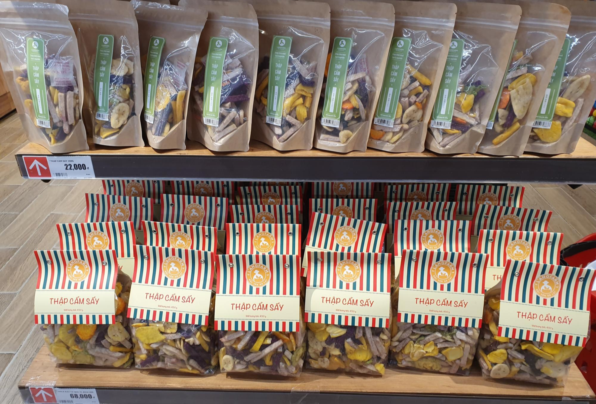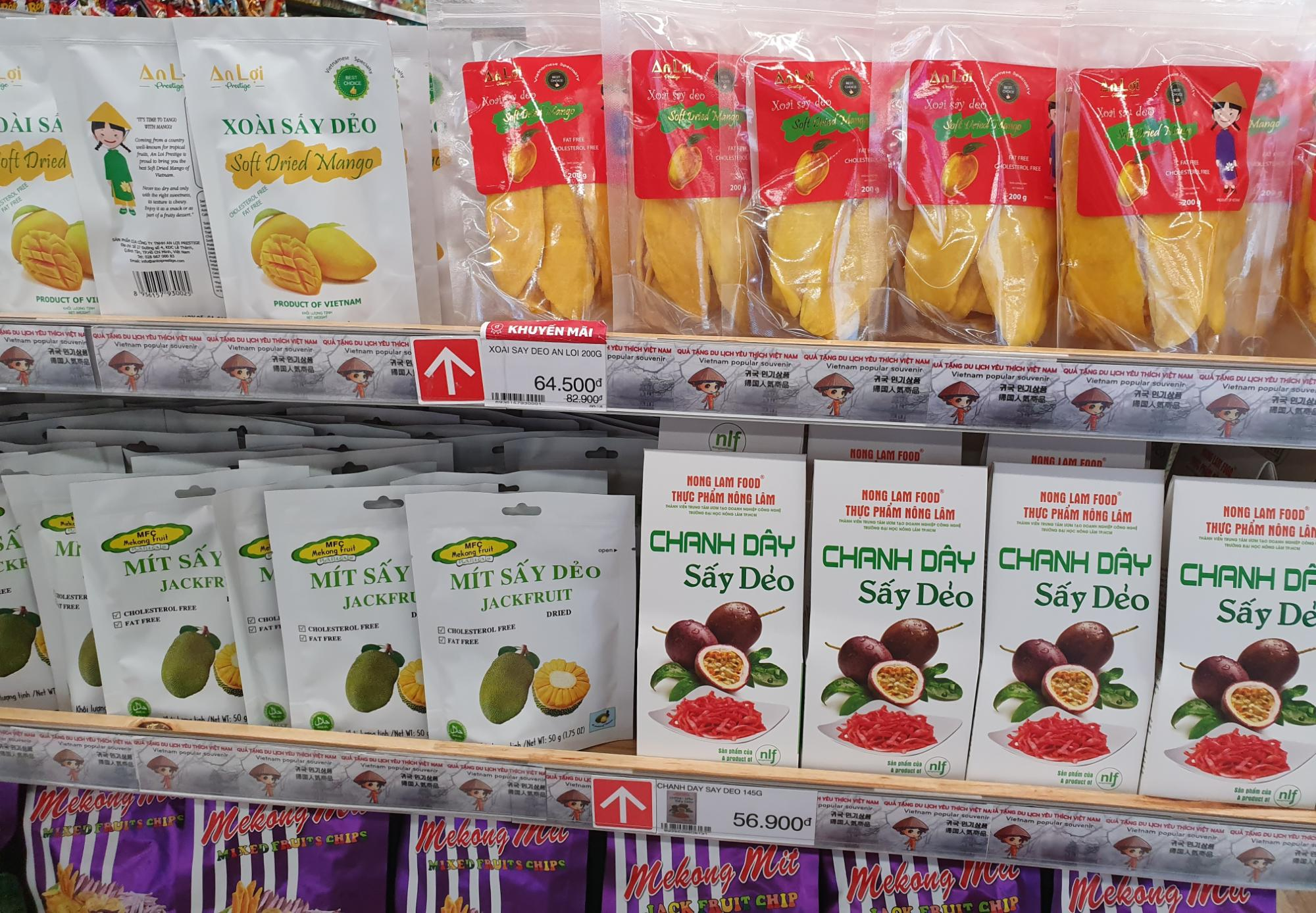 원래는 말린 망고나 잭푸르트를 사려고 했는데, 이제는 사가도 별로 반가워하지 않는 가족을 생각해서 새로운 과일을 찾았습니다. 바로 아래 사진에 있는 말린 과일을 살짝 튀긴 믹스 프루츠입니다. 작은 봉지는 한국돈으로 1,100원, 큰 사이즈는 3,400원입니다. 양도 적당하고 가격도 합리적이라 주워 담았습니다.