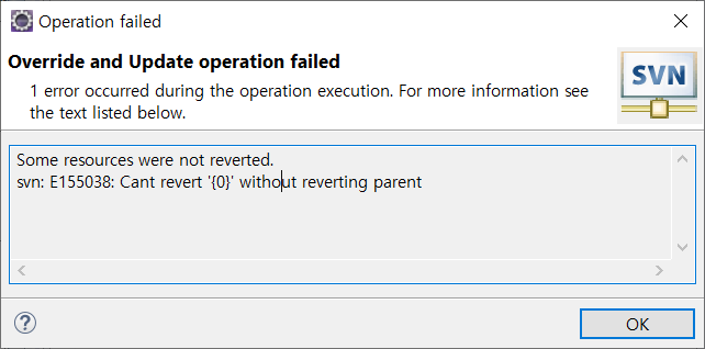 해당 오류는 SVN에서 충돌이 나는 소스를 업데이트나 revert 할 때 발생했다. 원인은 정확히 알 수 없으나 소스를 복붙 해서 그런 것 같다. 이럴 때 revert, override, update 아무것도 먹히지 않는다.