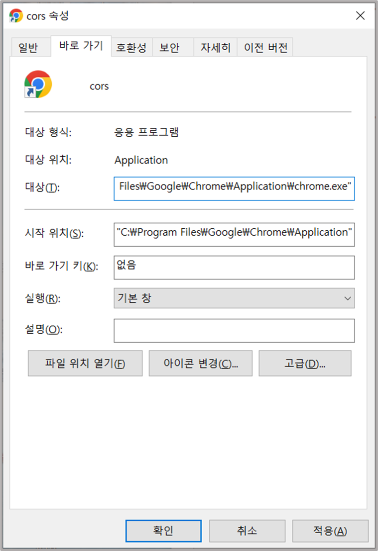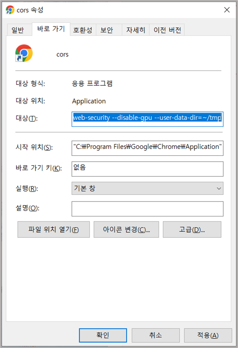 적용하고 난 뒤 크롬 바로가기를 다시 마우스 우클릭으로 여는데,