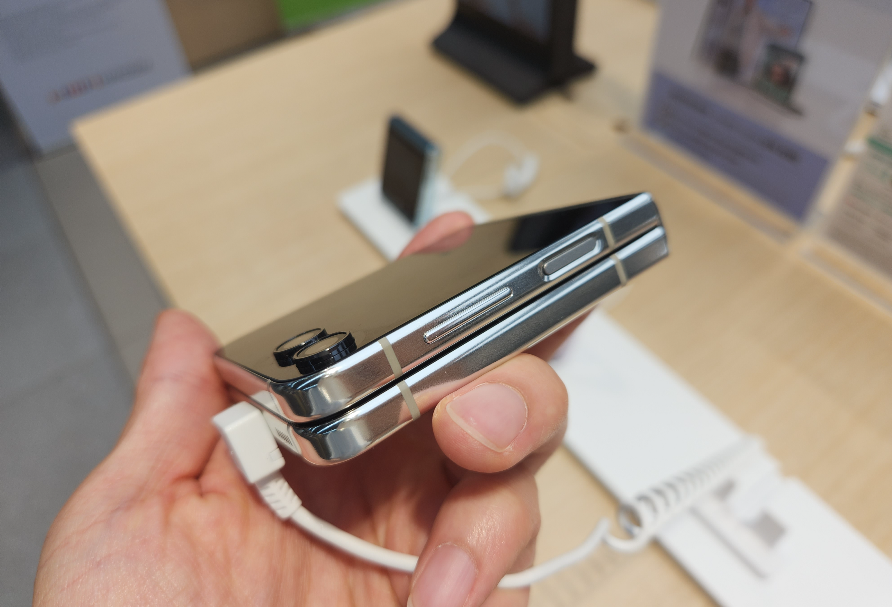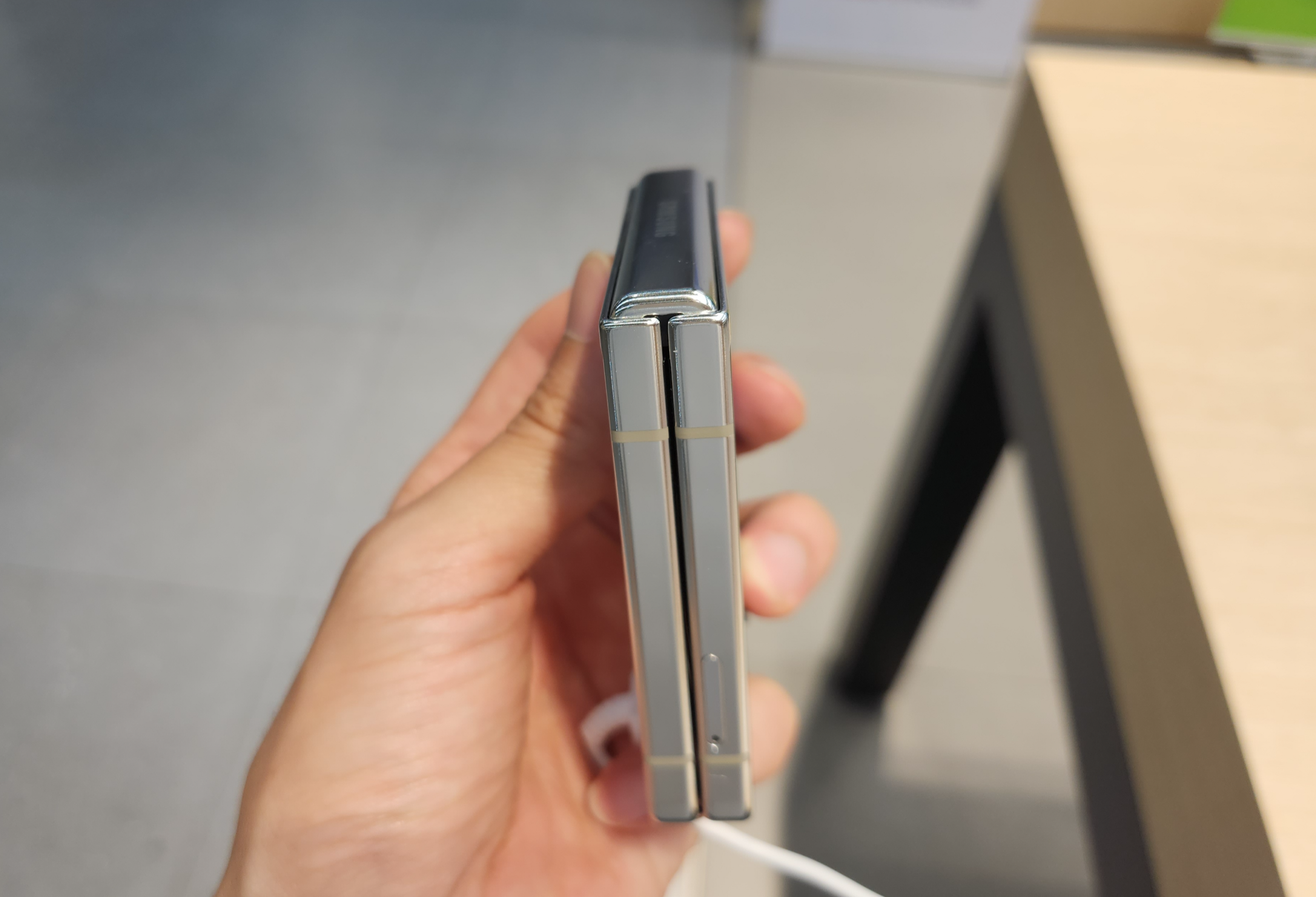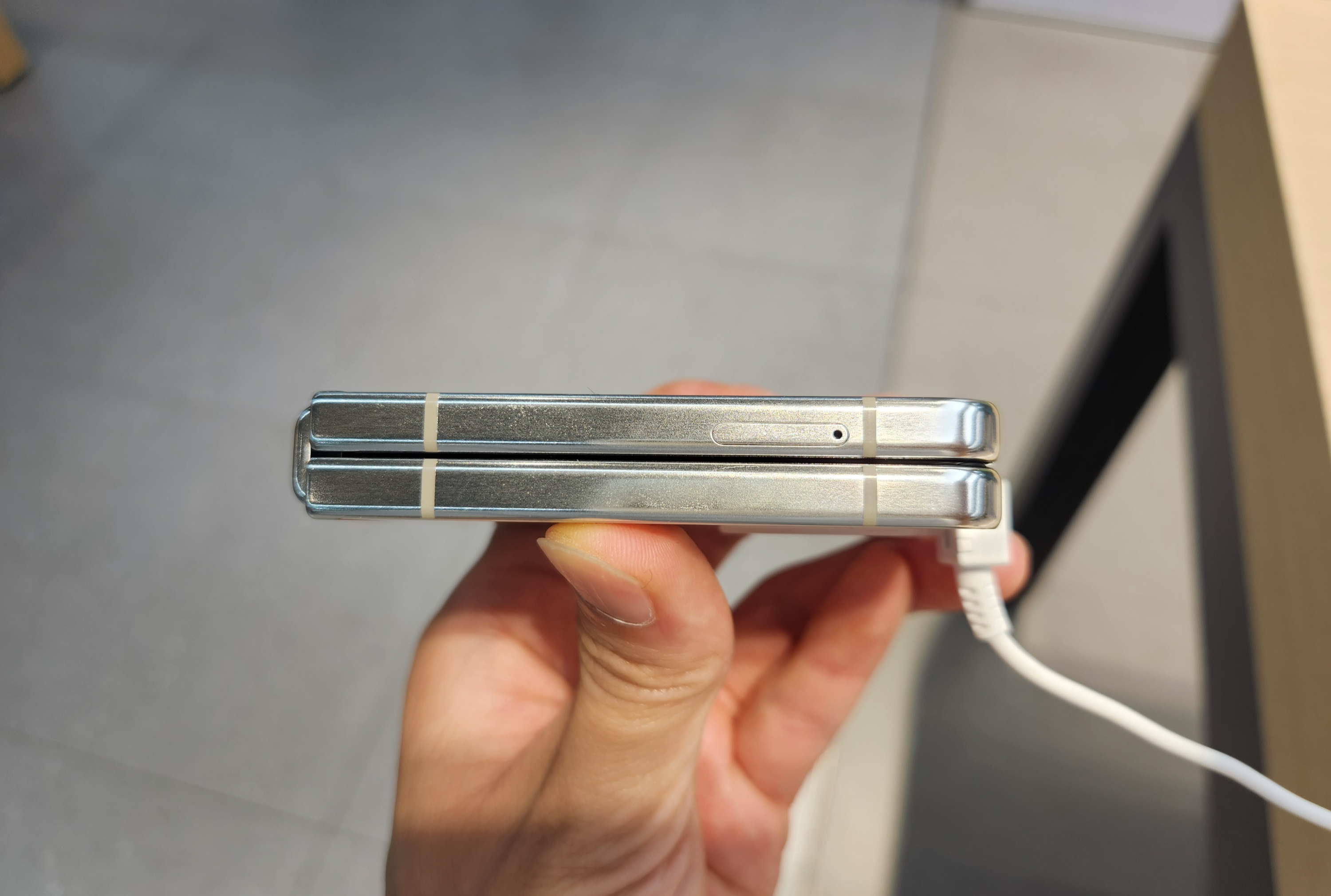 다음 변화는 플립5의 힌지에 있습니다! 힌지 부분 접었을 안쪽이나 바깥쪽이나 동일한 두께가 되었습니다. 이는 힌지 구조의 변화로 인한 것이며, 닫았을 때 힌지 부분은 최대 2mm 두께 감소가 생겼습니다. 다만 방수는 지원하나 방진을 지원하지 않는 건 아쉬웠습니다.