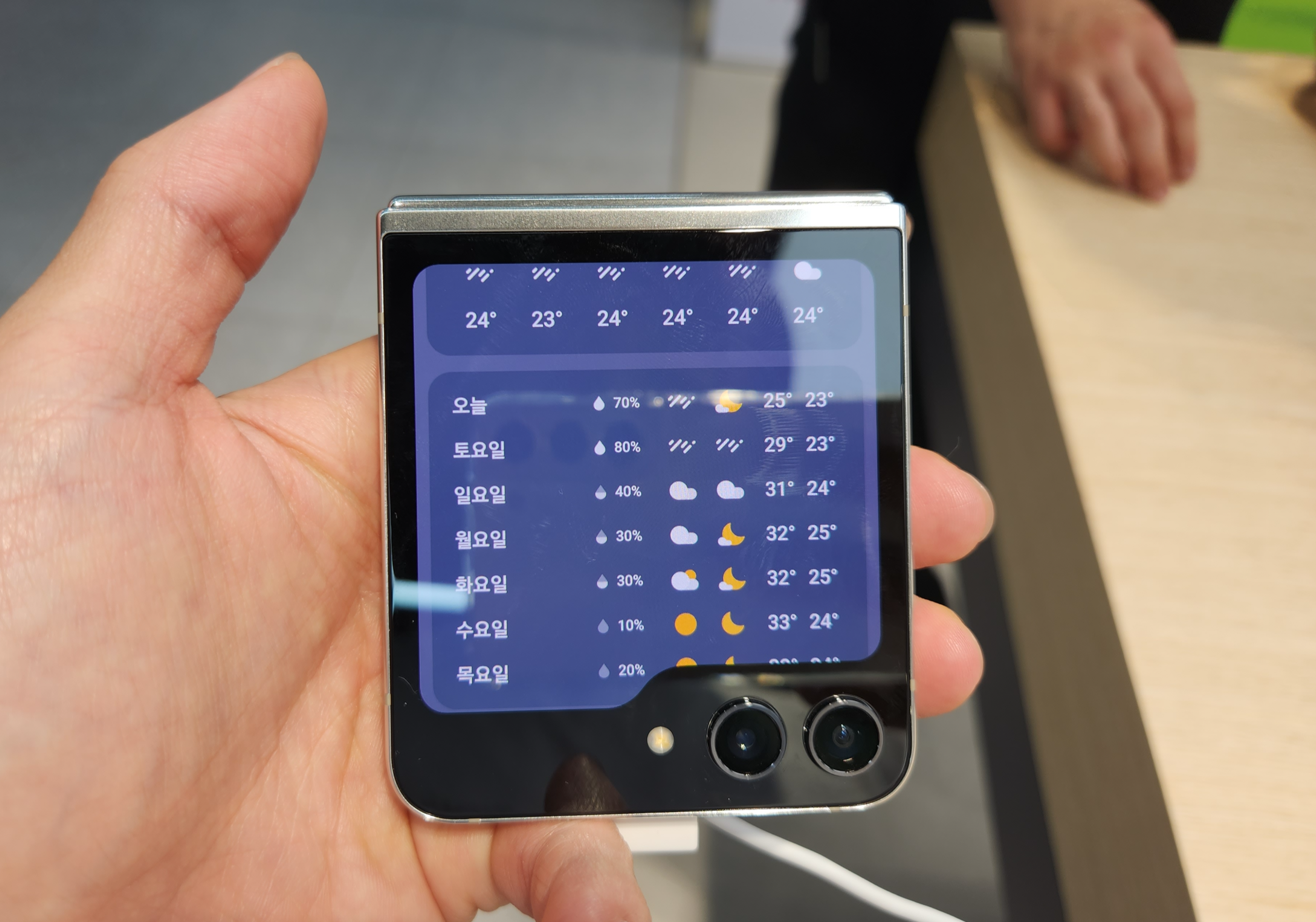 날씨 앱만 봐도 이젠 일주일치 날씨를 한 번에 조회할 수 있게 됐습니다! 외부 디스플레이가 이 정도 사이즈는 되어야 플립을 구매할 수 있을 것 같아서 이번 판매량은 기대가 되는 것 같습니다. 단 디스플레이가 넓어졌는데, 배터리 용량이 동일하고 60Hz 고정 주사율인 건 아쉬운 부분입니다.